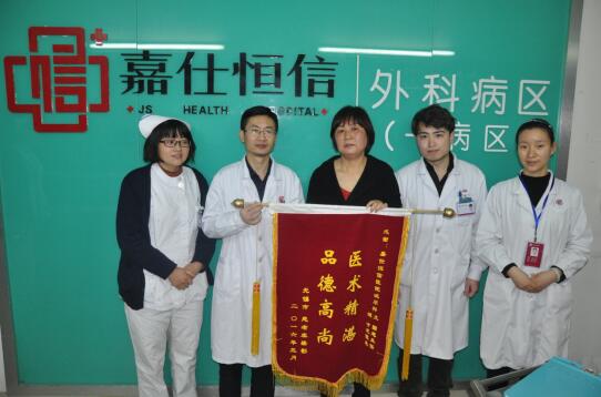 55岁虞女士,因左腰腹部疼痛不适多天,来无锡嘉仕恒信医院治疗,患者在社区医院B超检查为双肾结石伴左肾积水,左输尿管扩张。泌尿外科副主任医师文国忠主任接诊患者,安排其完善相关检查,经CT检查显示双肾多发小结石,左输尿管上段结石,其上输尿管及肾盂轻度扩张,腹平片(KUB)检查显示左输尿管上段结石。文主任确诊患者为左侧输尿管上段结石,左肾积水,尿路感染,双肾多发结石。于2016年3月16日,行体外冲击波碎石术治疗,术后有结石渣子排除,复查泌尿系CT显示左输尿管上段结石,于3月22日再次予以体外冲击波碎石术,术后仍见结石渣子排除,经过两次体外碎石将结石渣子彻底清除,患者不适症状消失,不日即痊愈出院。患者十分感谢医院泌尿外科文国忠主任、姚才元医生的精心诊治,特送锦旗以表感谢。